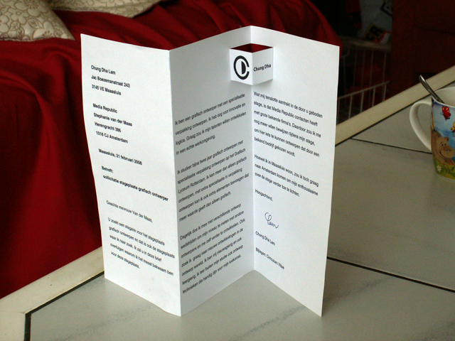This is my application letter with my own design plus bit my style of a simple pop-up interaction in the letter. As you see the letter is very different compared to a normal letter. You don’t have to stick with most of the standards, because this letter is your way of convincing a company of your design talent and you can already put your design in it.