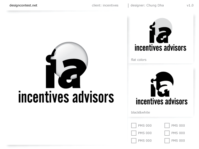 This is my entry for Incentives Advisors. The original logo they had used a magnifying glass and I tried to revise the logo keeping bit of the original and changed to a different magnifying glass that would enlarge the initials IA partially.