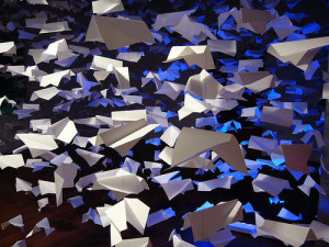 Very inspiring installations with many different materials. Here above you see an installation with the use of paper and colored lighting to give a special effect. Check more of his work on his Flickr page.