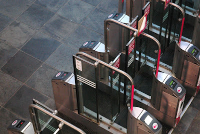 This is an assignment for FFTO. Here we may choose a own subject to make photos for and I choose the subway of Rotterdam. Here above you see the electric terminals before you enter the subway. I just captured this moment after someone went through them and while the doors were still open.