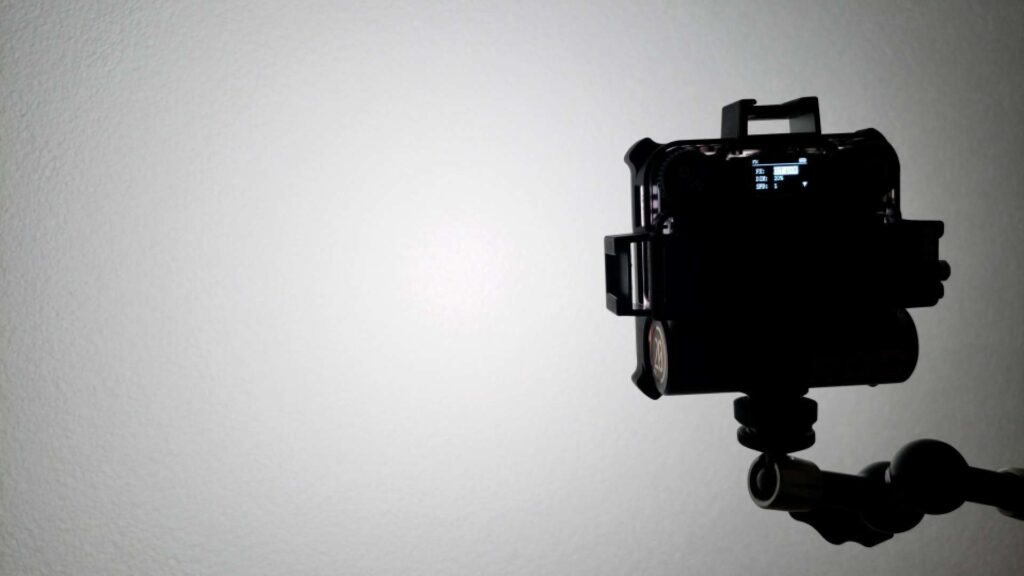 This is the Zhiyun Fiveray M20c, a very bright 20 watt tiny LED panel. So let’s directly go into the brightness test. So I put the M20 1 meter away from my phone so we get the LUX at 1 meter. First output at 100% and going through all major kelvin values.